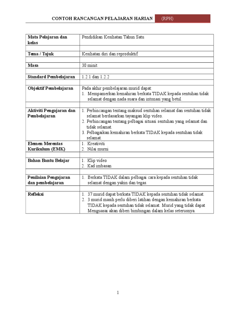 Rph Tahun 1 Kssr Rancangan Mengajar Tahun 1 Pendidikan Kesihatan Contoh Pdf