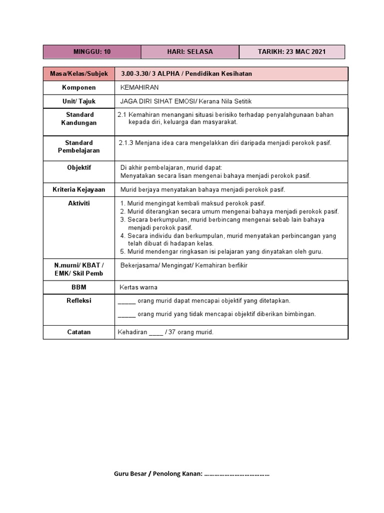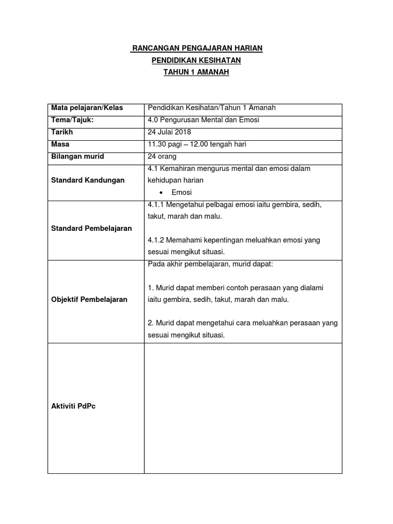 Rancangan Pengajaran Harian Pendidikan Kesihatan Tahun 1 Amanah Pdf